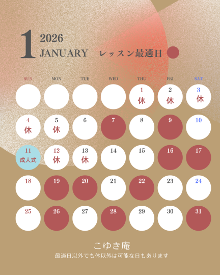 最適日以外でもお休みの日以外レッスンできる日もあります。初めての生徒さんはカレンダー関係なくお気軽にお問い合わせください。