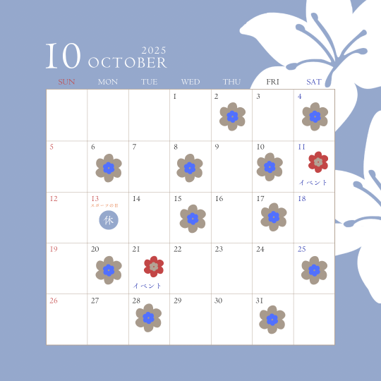 お花の付いている日がレッスン最適日です。この日以外にも可能な日はありますので気軽にお問い合わせください。日曜日のレッスンも可能です、こちらもお問い合わせくださいね。