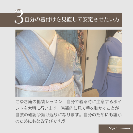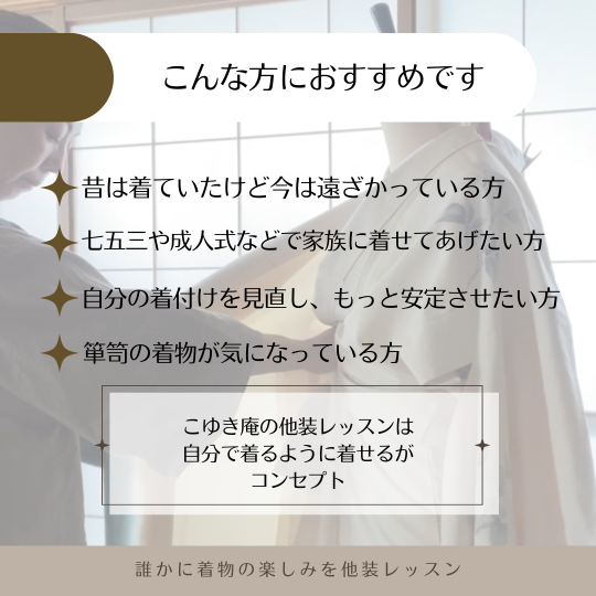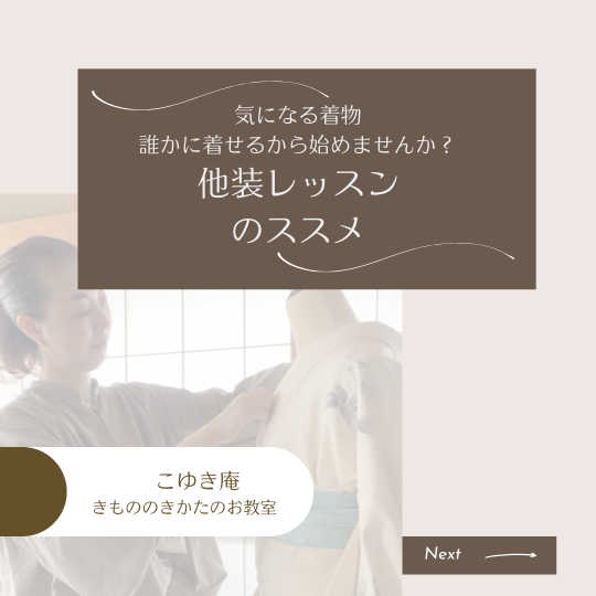 こゆき庵の他装レッスン、自分で着るときのポイントを抑えながら楽で綺麗を目指します。